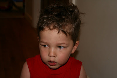 Let me just say that the combination of sick and bedhead is just hysterical. Our intentions were to get the boys' haircuts while we were here. After they got sick, that was just not going to happen. Noah and Matthew have curly hair. Noah loves using juice from his fresh fruit to style his hair. Then he plays with it. I just had to laugh at the boys when they woke up this particular morning.